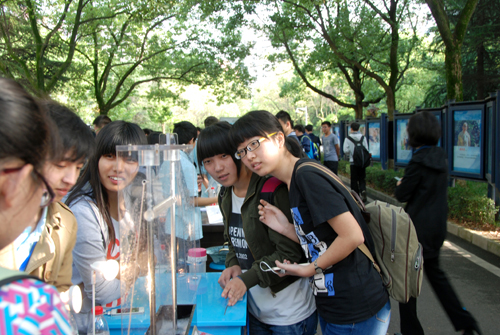 开幕式结束后,与会师生参加了现场数理趣味知识竞赛的互动活动,参观了数学文化系列展览,体验了物理实验开放项目。活动现场吸引了众多师生驻足观看。数理趣味知识竞赛让同学们“脑洞大开”;数学文化展板让同学们透过生活中的知识了解不一样的数学;院士长廊处,“电磁炮”“共振娃娃”“伽尔顿板”“蛇形摆”“蒸汽机”等一个个有趣的物理实验经过相关工作人员的讲解,让大学生、中小学生们深刻体会到了数理科学的魅力所在。开幕式当天,3000余人次参加了数理文化活动季的相关活动。