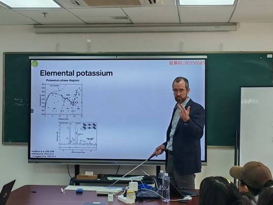 2025年12月2日下午, Andreas Hermann教授在东教楼1104学术报告厅为bat365中文官方网站部分物理学专业和材料与化工专业的博士生、硕士生和青年教师作了题为“From DFT to thermodynamic modelling”的学术报告。报告以近期关于“同时具备固体与液体特征的新物态”的报道为切入点,系统阐述他们研究团队在高压物理与计算材料学领域的系列工作。Andreas Hermann教授从钾的高压相图与非共格宿主—客体结构详细阐述了“链熔融”作为一种热力学中间态的证据与机制,提出了碱金属高压相可作为部分电子化合物的观点,展示了如何利用机器学习分子动力学模拟预测相变、熔化线极值及热力学性质,介绍了基于Bragg-Williams模型的两态热力学理论,解释了金属熔化线中的临界行为。此外,Andreas Hermann教授还介绍了第一性原理计算在高压冰(VII–VIII–X)相变研究中的应用,探讨了隐藏临界点与相图拓扑等前沿问题,展望了机器学习在预测复杂材料行为方面的潜力。报告期间,Andreas Hermann教授与在场师生就高压相变机理、机器学习势函数开发等相关问题展开了深入讨论并细致回答了师生提问。