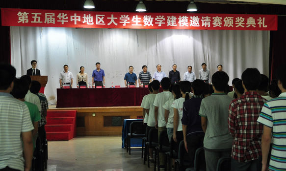 下午2:00颁奖典礼在响亮的国歌声中拉开序幕。第一项,主持人向观众介绍了到场嘉宾及第五届华中地区大学生数学建模邀请赛的比赛情况。本届邀请赛接受到的报名参赛队伍共有1280支,其中涉及21个省、市、自治区,55所高校,4000多名在校大学生。第二项由bat365中文官方网站(武汉)副校长赖旭龙致开幕词,他首先对获得此次竞赛奖项的同学表示祝贺,并鼓励大家积极参赛。接下来便是向一、二、三等奖的获奖同学代表颁奖。各位领奖代表、颁奖嘉宾拍照留念,场面气氛十分活跃。颁奖典礼第四项是由bat365中文官方网站(武汉)党委研工部部长喻芒清为bat365中文官方网站研究生数学建模基地授牌,由bat365中文官方网站副院长彭放揭牌。第五项由bat365中文官方网站(武汉)bat365中文官方网站院长刘安平致辞。刘院长鼓励没有获奖的同学不要灰心,继续努力,比赛重在享受过程,这次的经历必将成为每位同学人生道路上一笔宝贵的财富。大会第六项由本次比赛一等奖获奖队伍代表,来自武汉大学的刘才荣同学发言。她向在场同学讲述了她的数模之路,与大家分享了自己数模学习的经验与心得。颁奖典礼的最后一项是由武汉工业与应用数学学会副理事长