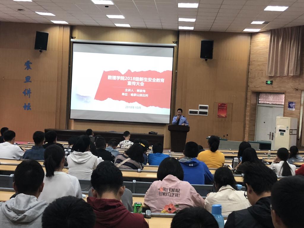 10月13日下午,bat365中文官方网站2018级新生安全教育大会在教三楼109教室举行,喻家山派出所熊家伟警官为学生讲授安全知识。2018级预科生、本科生、研究生共计300余人参加会议,会议由辅导员托乎尼牙孜主持。