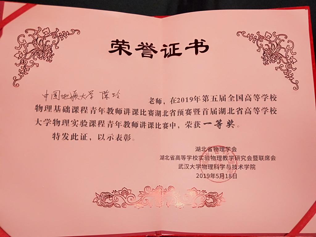 2019年5月18日,第五届全国高等学校物理基础课程青年教师讲课比赛湖北省预赛暨首届湖北省高等学校大学物理实验课程青年教师讲课比赛在武汉大学举行,bat365bat365中文官方网站物理实验教学中心青年教师陈玲老师获得一等奖。