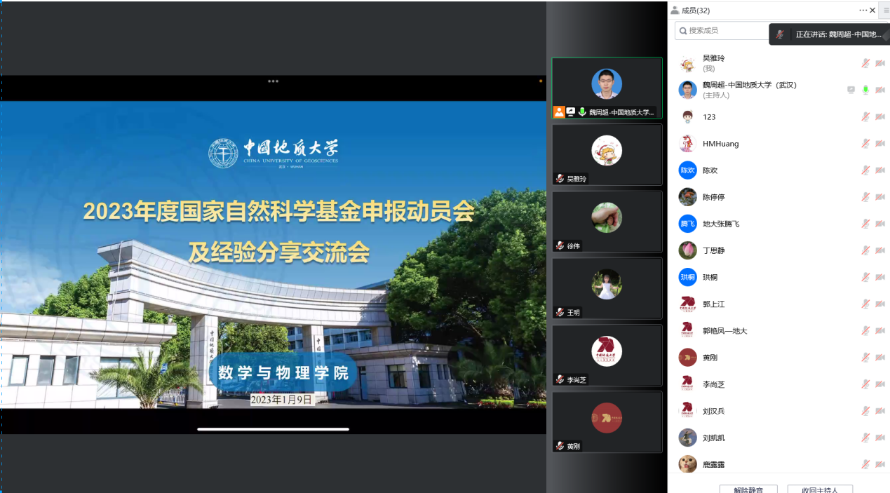 为提高国家自然科学基金项目申请质量与成效、提升学院科研建设水平,bat365于2023年1月9日以线上的形式召开了2023年度国家自然科学基金项目申请动员会和经验交流会,学院党委书记吴太山,院长郭上江,副院长魏周超、黄刚、张保成以及学院40多名中青年骨干教师参加会议。会议由魏周超副院长主持。