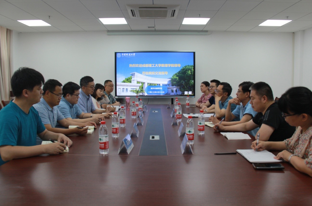 2023年6月15日下午,成都理工大学bat365中文官方网站副院长张传瑜、基础数学教学部主任余海洋、基础数学教学部支部书记舒畅、大学物理教学部副主任史顺平、田荣刚等一行来bat365进行工作交流。学院副院长黄刚、副院长张光勇、大学物理教学部主任陈琦丽、数学系主任王毅、大学数学教学部主任郭艳凤、物理实验中心主任何开华出席了此次会议。会议由副院长黄刚教授主持。