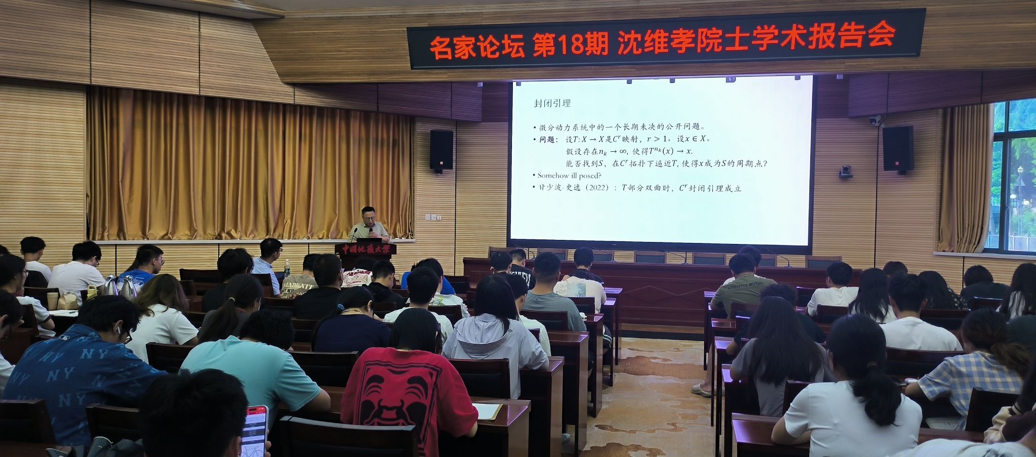 在本次报告中,沈维孝教授首先从动力系统的背景出发,引入了包括不变测度、Poincare回复定理、遍历定理、遍历优化、一致扩张映射等概念。他重点介绍了自己与合作者对于一致扩张映射在不同维数下普遍周期和通有周期的最新研究进展和成果,包括对sub-actions、特殊方向、封闭引理、最大测度零熵等方面的思考,简明扼要地阐述了圆周扩张映射上的线性斜积与遍历优化问题之间的联系,并指明了未来可进一步研究的问题和方向。