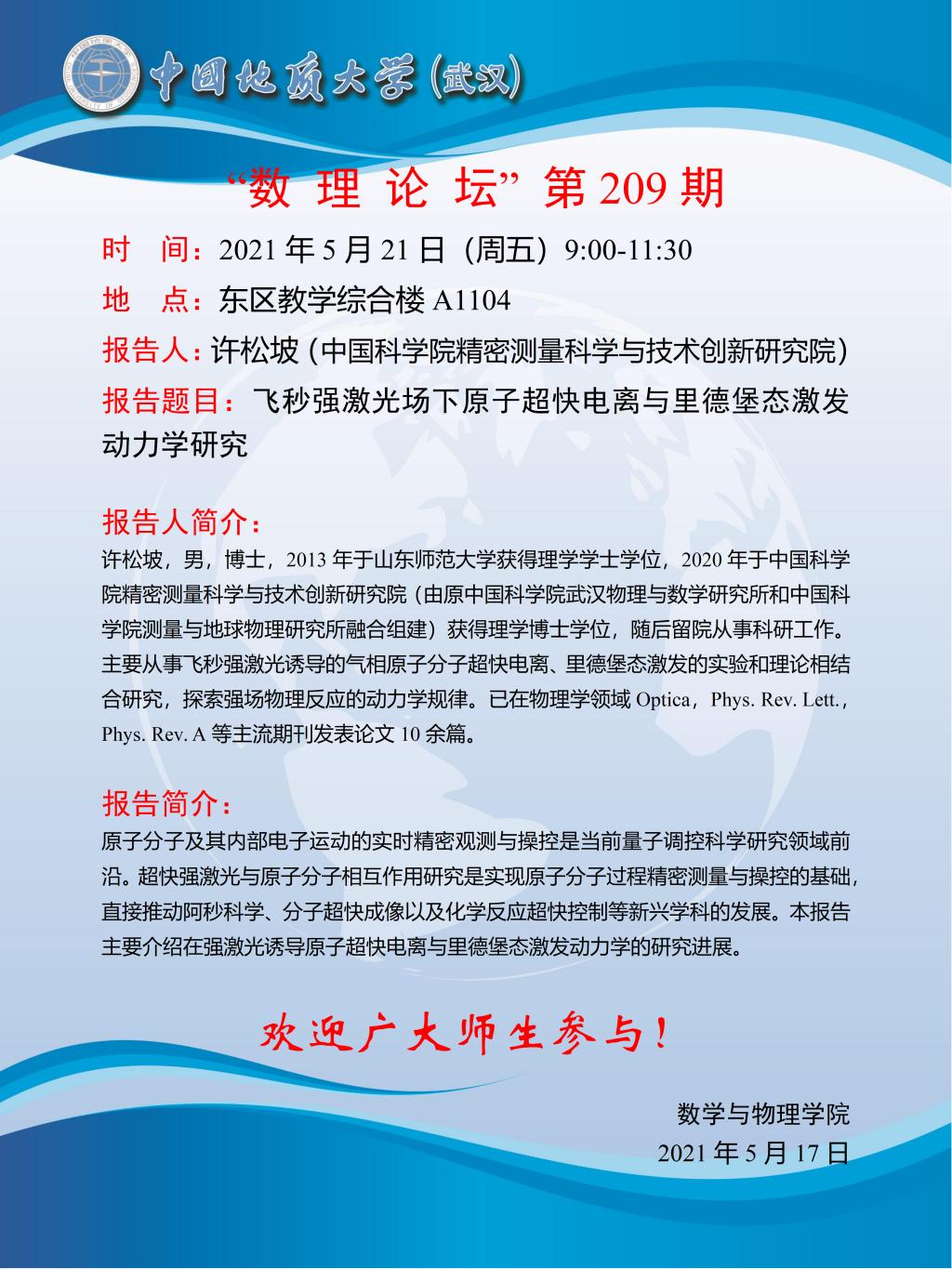 "数理论坛"第209期:飞秒强激光场下原子超快电离与里德堡态激发动力学研究