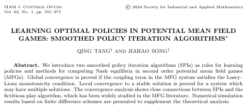bat365信息与计算科学系教师汤庆博士为第一作者的学术研究工作 “Learning Optimal Policies in Potential Mean Field Games: Smoothed Policy Iteration Algorithms” ,最近发表在国际著名期刊SIAM Journal on Control and Optimization。该论文第二作者为bat3652020 级应用统计专业硕士生宋家豪。汤庆博士自2015年入职bat365,主要从事动态博弈相关的偏微分方程理论、数值计算及在经济模型中的应用研究。