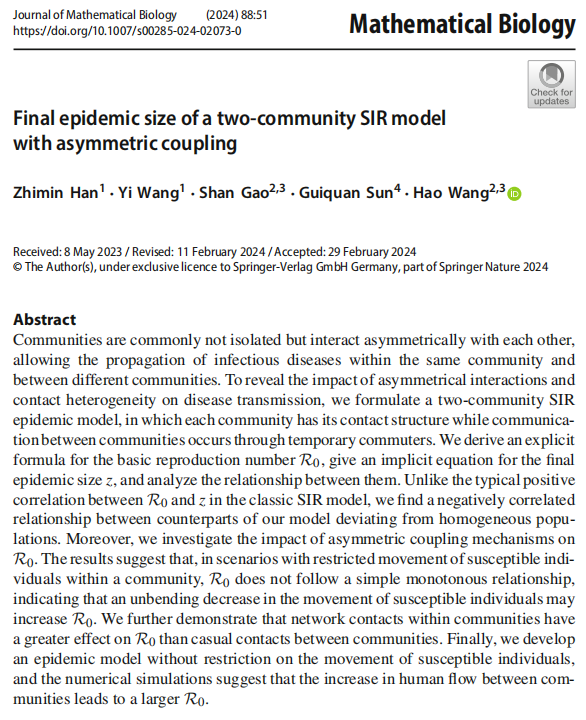 近日,bat3652021级博士生韩志敏以第一作者身份在国际生物数学主流期刊《Journal of Mathematical Biology》上发表题为“Final epidemic size of a two-community SIR model with asymmetric coupling”的学术论文。该论文第二作者为指导教师王毅副教授,通讯作者为加拿大数学生态学和流行病学跨学科实验室主任、阿尔伯塔大学数学与统计科学系王皓教授。