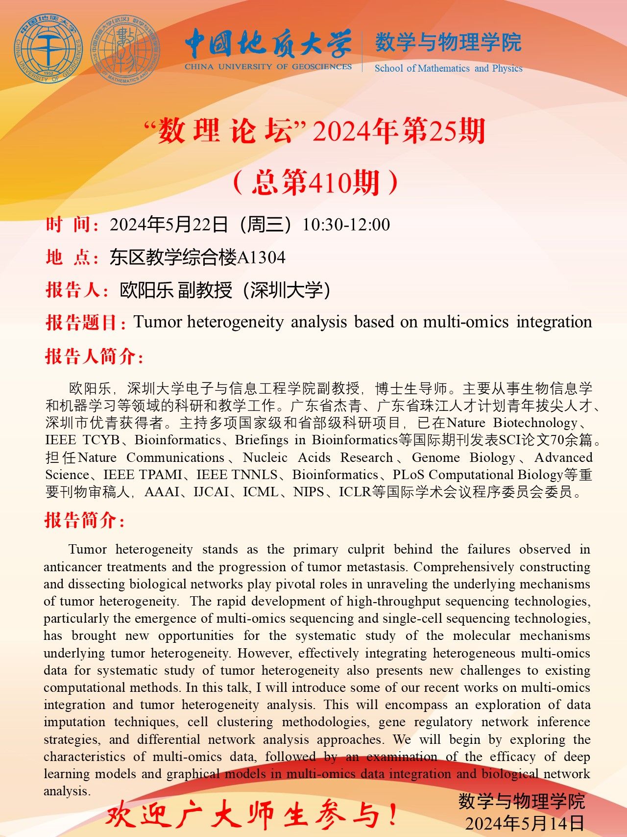 2024年5月22日欧阳乐副教授学术讲座:Tumor heterogeneity analysis based on multi-omics integration