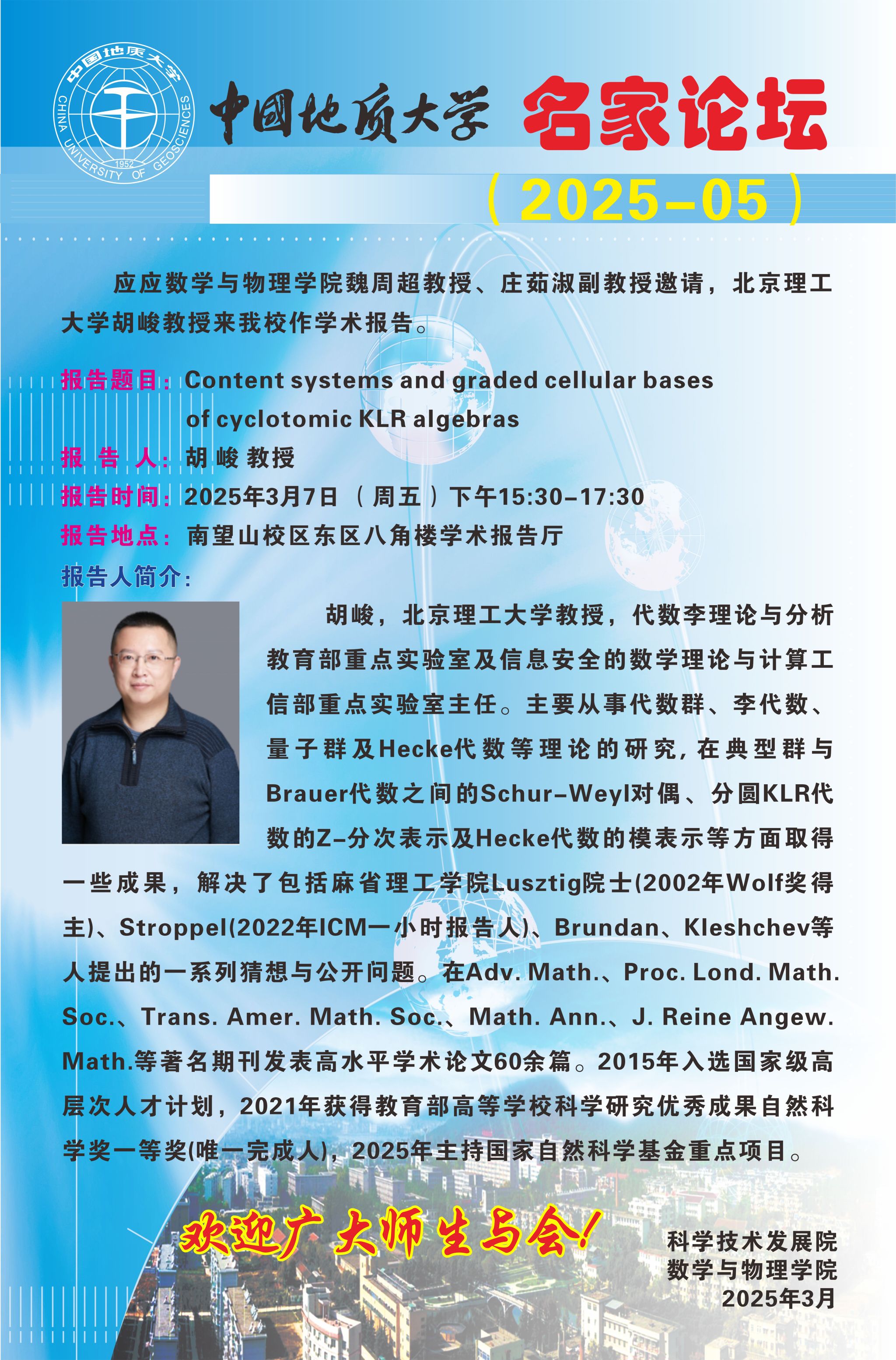 2025年3月7日胡峻教授学术讲座:Content systems and graded cellular bases of cyclotomic KLR algebras