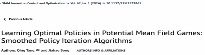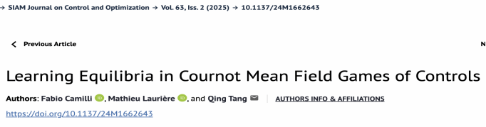 bat365信息与计算科学系教师汤庆博士作为通讯作者的工作 “Learning Equilibria in Cournot Mean Field Games of Controls” 最近发表于SIAM Journal on Control and Optimization。