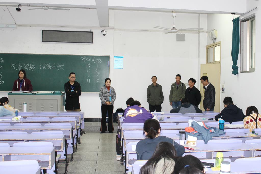 这是该项赛事首次在bat365设置考点,学校教务处高度重视,在考场安排、考务人员安排等方面给予了大力支持。考试期间,教务处副处长张建和、实践教学科王仲停老师到场巡视指导。学院周密部署精心组织,选派了13名年轻教师和4名研究生担任监考,学院党委书记吴太山、副院长张光勇到场巡视指导。教务处领导、学院领导与湖北省竞赛组委会巡视员——武汉大学胡元明老师进行了广泛深入的会谈交流。