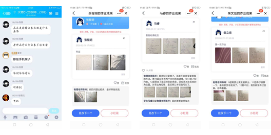 随着网络教学的深入,网络上各种教学资源也多了起,这些资源在备课与教学过程中提供了很大的帮助。但是隔着屏幕的学习始终让陈老师心里没底,学生到底有没有认真学呢。陈老师始终认为要想学生认真,首先老师要认真。就拿布置作业来说,陈老师认真批改了每一份作业,并写上评语,分析错在哪里,并让学生订正之后重新传给她,对于错得太多的学生,会让他们单独找她答疑,然后一个个给他们讲,让他们把基础打牢固。作业中一些共性问题,会在QQ群里集体解答,或者有多的时间在上直播课时专门讲解一遍。为了提高学生的学习兴趣,陈老师利用成果管理软件来批改作业,通过红花来评价学生作业的完成情况,很多同学怕红花太少,作业都能够认真的完成。手机上看学生上传的图片,非常累眼睛,只能改几份休息一会,除了上课时间陈老师几乎都在改作业。孩子总说:“妈妈你怎么总是玩手机啊?”陈老师只能笑一笑说妈妈这是在工作呢!