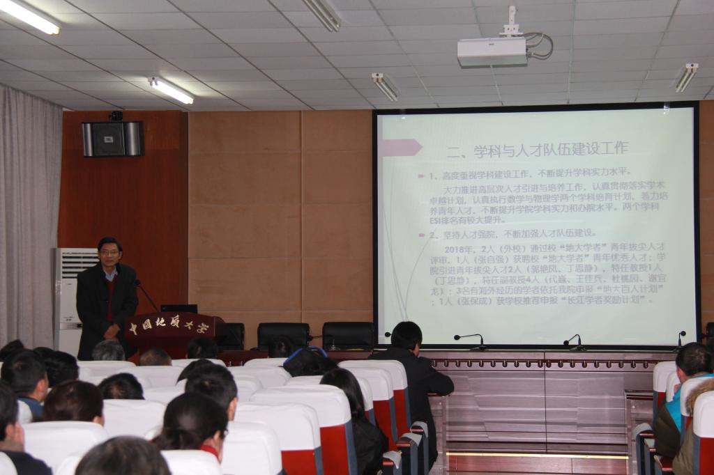 院党委书记吴太山对大会进行了总结。他代表学院党委和行政对一年来付出辛苦劳动的全院师生员工表示衷心的感谢,对受表彰的先进个人表示衷心的感谢并表示热烈的祝贺,对学校领导、各职能部门和兄弟单位的大力支持和帮助表示了感谢!他对本次会议的圆满举行给予了充分肯定,会议主题明确、内容丰富、准备充分、成果显著,是一次成功的大会,鼓劲的大会,也是一次明确奋斗方向的大会。他就学院2019年各方面的主要工作提出了意见和建议,希望广大教师要秉承“艰苦朴素、求真务实”的校训精神,弘扬“严在地大”的校风学风,只争朝夕,开拓进取,一件事一件事去做,一步一个脚印把学院各项事业继续推向前进,为学校建设地球科学领域国际知名研究型大学做出应有的贡献。