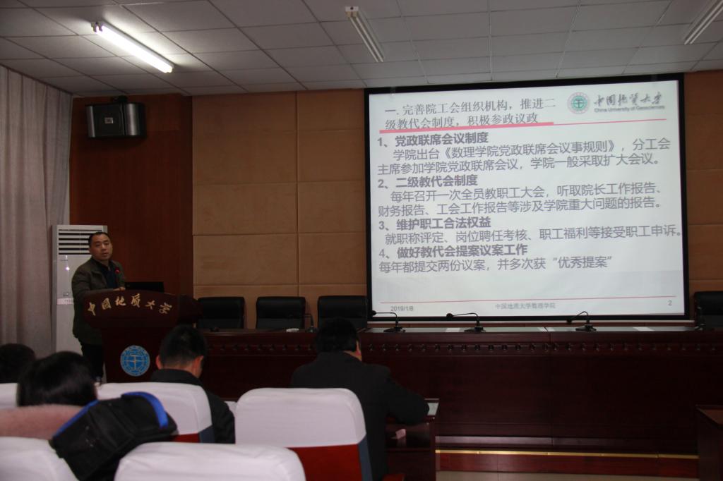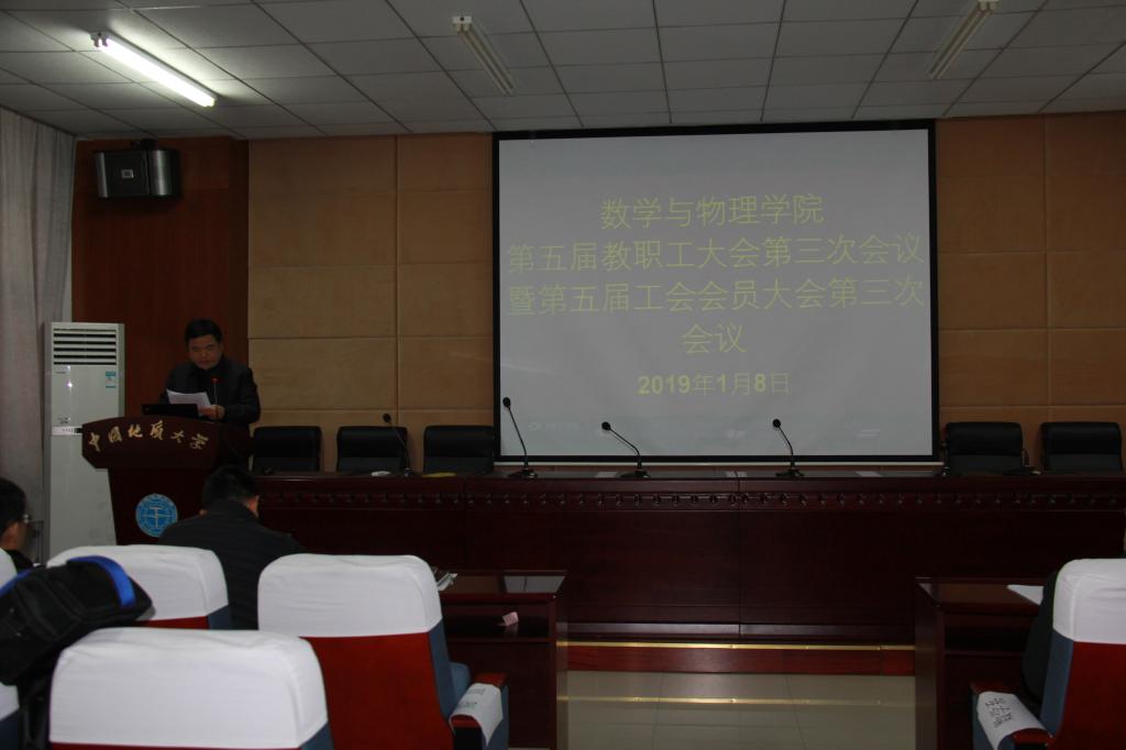 2019年1月8日下午,bat365中文官方网站第五届教职工大会第三次会议暨工会会员大会第三次会议在学海楼109会议室隆重召开。校党委副书记王林清、校工会常务副主席喻芒清应邀出席大会,学院党政领导及全体教职工参加会议。大会分两阶段进行。