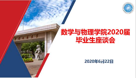 会议首先由院党委书记吴太山寄语。吴书记首先代表学院党委对毕业生们即将顺利毕业表示祝贺。吴书记结合今年抗击疫情的大背景和形势,充分肯定了数理学子在抗击疫情过程中所作出的贡献。同时,吴书记对毕业生们也提出了两点希望:一是希望大家无论升学还是工作,都要心系国家,服务人民,不忘初心,牢记使命;二是希望同学们心系地大,踏入工作岗位了也能多关心母校、母院的发展,有时间常回地大看看。