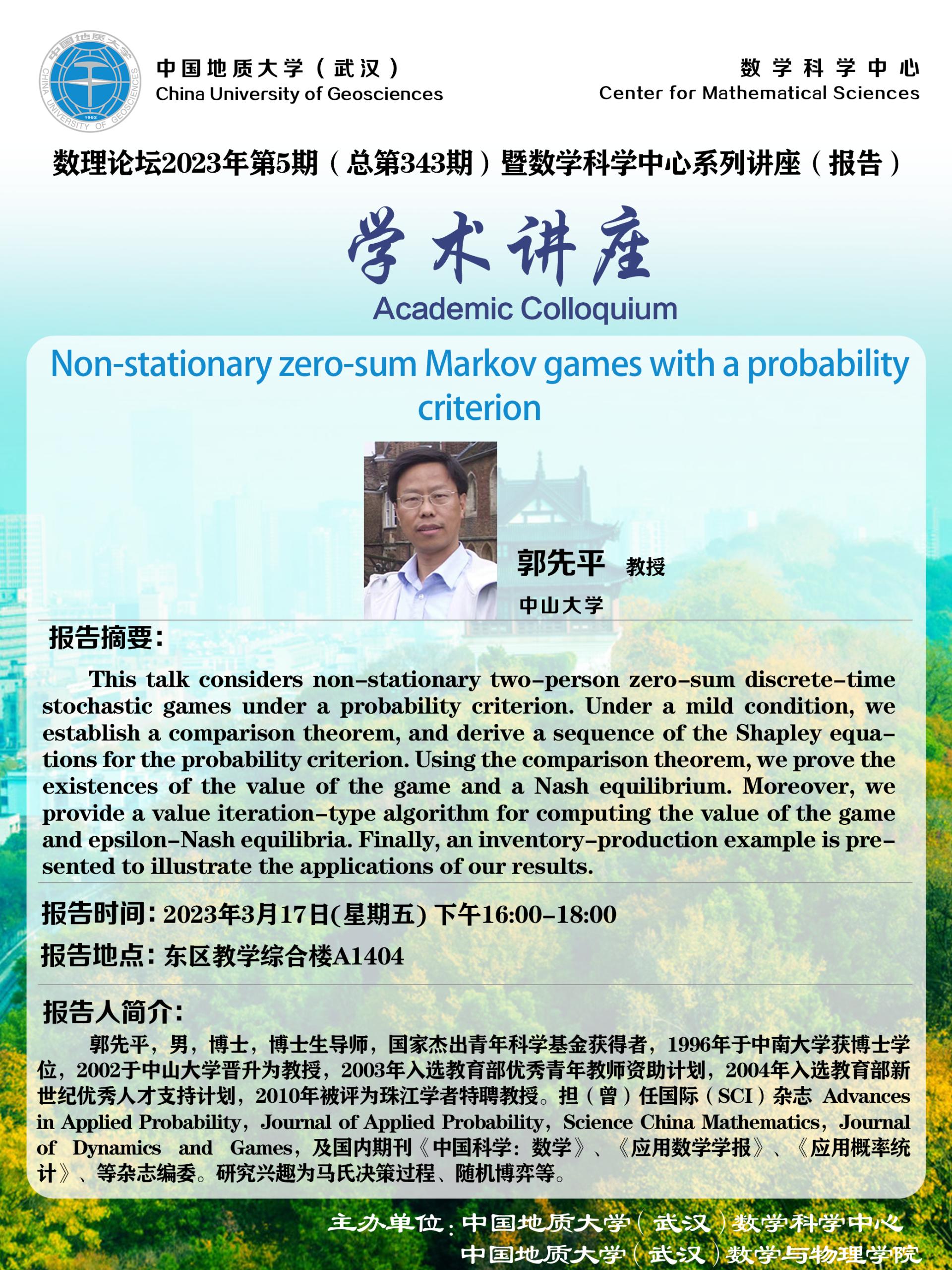 2023年3月17日郭先平教授学术讲座:Non-stationary zero-sum Markov games with a probability criterion